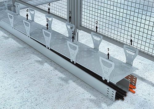 Het betreedbare kabelgootsysteem belooft flexibiliteit in elke situatie. Dat geldt ook bij de montage. De kabelgoten kunnen op verschillende manieren worden gemonteerd en kunnen zo op de individuele eisen worden aangepast. De keuze is aan u: door de slipvaste kabelgoten op een draagarm te installeren, wordt voldaan aan de arbeidsveiligheidsrichtlijnen om uitglijden en struikelen te voorkomen en wordt de opstaphoogte in acht genomen. Een speciale beschermplaat voor de steun vermindert het struikelgevaar. Met de eenvoudige en snelle montagevarianten van de kabelgoten op een Z-steunprofiel wordt de staphoogte aangehouden. Ook door de montage van de slipvaste kabelgoten op een Z-steun wordt de staphoogte aangehouden. Beschermplaten als bekleding op de zijkant verminderen het struikelgevaar. De meest eenvoudige en snelste manier om de kabelgoten voor de vloer te installeren is de vloermontage. Een lagere staphoogte en de slipvaste eigenschappen van het ribbelplaatdeksel maken veilig werken te allen tijde mogelijk.
