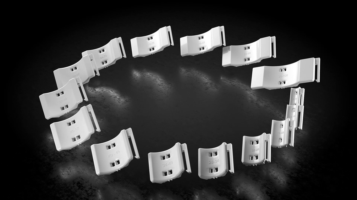 Zo hoeft vanaf nu, in plaats van vele verschillende tegenplaten slechts nog één type op voorraad gehouden te worden om alle toepassingen met de verschillende voetvormen en spanmaten af te dekken. Op de tegenplaten is altijd het bijbehorende spanbereik aangegeven, zodat in een oogopslag gecontroleerd kan worden of het artikel bij de toepassing past.