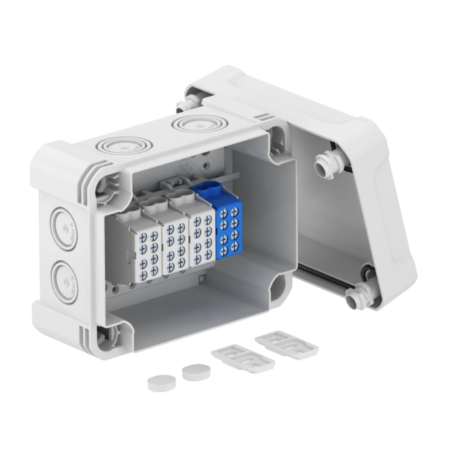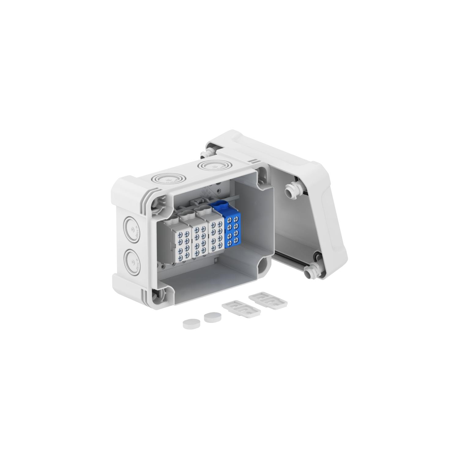 ProductbeschrijvingKabeldozen met klem voor verbinden van kabels en leidingen in binnenopstelling en buitenopstelling. Rechthoekig model met doorbreekinvoeren. Geschikt voor de wand-/plafondmontage met de mogelijkheid tot buitenbevestiging, binnenbevestiging of montage via het hoekelement. Bijzonder slagvast met IK09. Deksel met snelsluiting, verzegelbaar. Gefabriceerd van halogeenvrij en UV-bestendig materiaal. Inclusief 4-polige hoofdleidingaftakklem, elk met 2 x 25 mm² + 2 x 16 mm² geleideraansluitingsdoorsneden per pool.