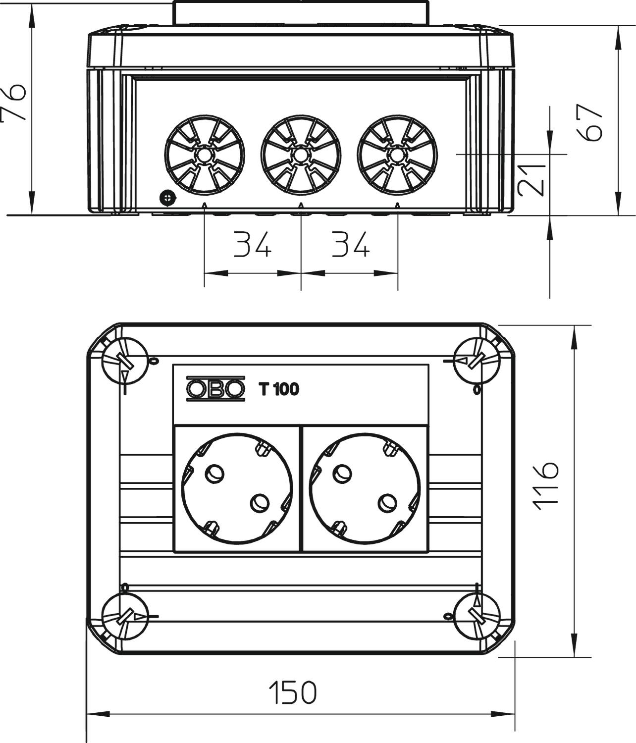 Kabeldozen T 100, 2 Module 45-contactdozen in het deksel, 1-polig