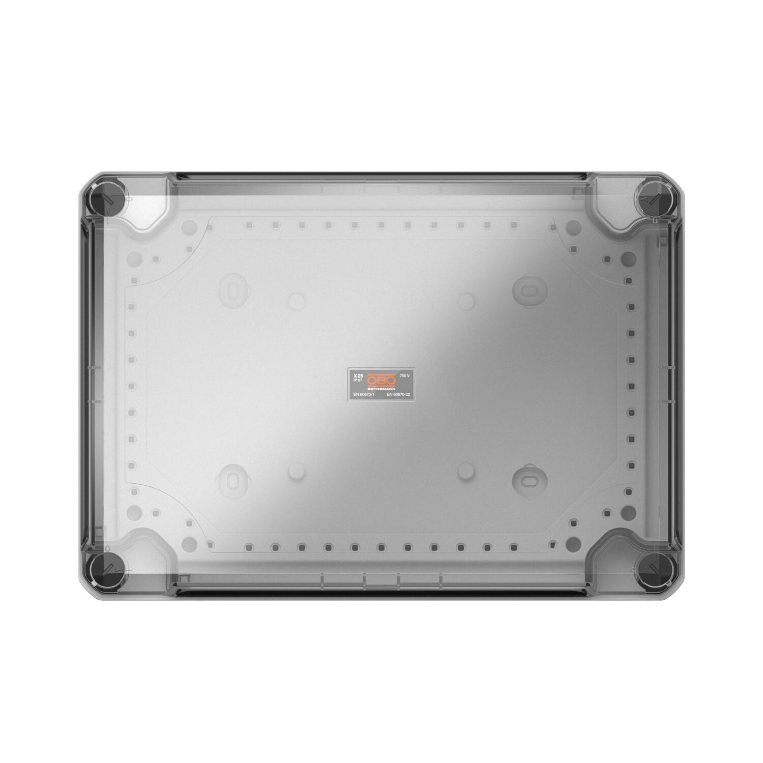 Kabeldoos conform DIN EN 60670. Vlamvertragend volgens DIN EN 60695-2-11, testtemperatuur 650°C. Slagvastheid IK08 conform NEN-EN 50102. Beschermingsgraad IP67 conform NEN-EN-IEC 60529.