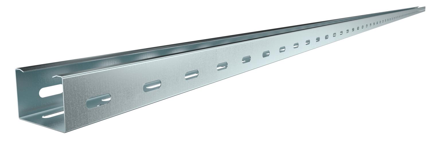 Kabelgoot met doorlopende bodem- en zijperforatie alsmede centrale perforatie (Ø11 mm) in de bodem voor extra bevestigingen.