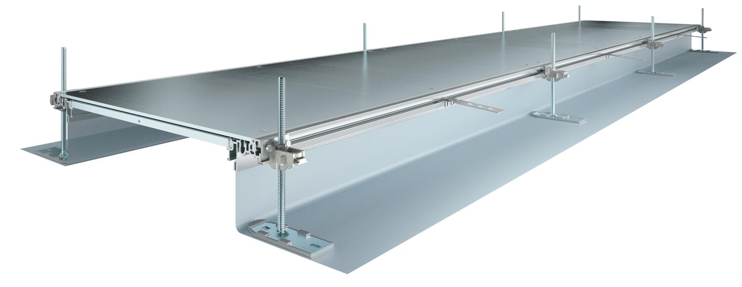 ProductbeschrijvingMontageklare kanaaleenheid, gelijkliggend met de dekvloer voor de distributie van kabels, bestaande uit 3 systeemdeksels, 2 zijprofielen met flexibele zijwand van metalen weefsel, vloerbekledingsprofielen met H = 3 mm. Voor droge binnenruimten met droog onderhouden vloeren. Met het bijbehorende systeemtoebehoren ook geschikt voor nat onderhouden vloeren. In de leveringsomvang zijn begrepen: 6 in hoogte nivelleerbare bevestigingshoeken, 6 dekvloerankers en 3 dekselvoegafdichtingen bij nominale kanaalbreedtes 200, 300 en 400 of 6 dekselvoegondersteuningen bij kanaalbreedtes 500 en 600. De noodzakelijke nivelleereenheden voor de dekselondersteuningen 400, 500 en 600 worden niet meegeleverd maar moeten afhankelijk van de gewenste kanaalhoogte afzonderlijk worden besteld. De kanaaldeksels zijn bij de levering vastgeschroefd.