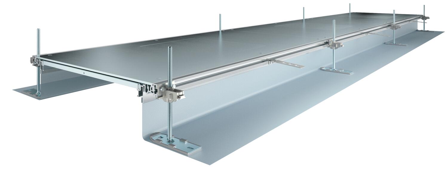 ProductbeschrijvingMontageklare kanaaleenheid, gelijkliggend met de dekvloer voor de distributie van kabels, bestaande uit 3 systeemdeksels, 2 zijprofielen met flexibele zijwand van metalen weefsel, vloerbekledingsprofielen met H = 3 mm. Voor droge binnenruimten met droog onderhouden vloeren. Met het bijbehorende systeemtoebehoren ook geschikt voor nat onderhouden vloeren. In de leveringsomvang zijn begrepen: 6 in hoogte nivelleerbare bevestigingshoeken, 6 dekvloerankers en 3 dekselvoegafdichtingen bij nominale kanaalbreedtes 200, 300 en 400 of 6 dekselvoegondersteuningen bij kanaalbreedtes 500 en 600. De noodzakelijke nivelleereenheden voor de dekselondersteuningen 400, 500 en 600 worden niet meegeleverd maar moeten afhankelijk van de gewenste kanaalhoogte afzonderlijk worden besteld. De kanaaldeksels zijn bij de levering vastgeschroefd.
