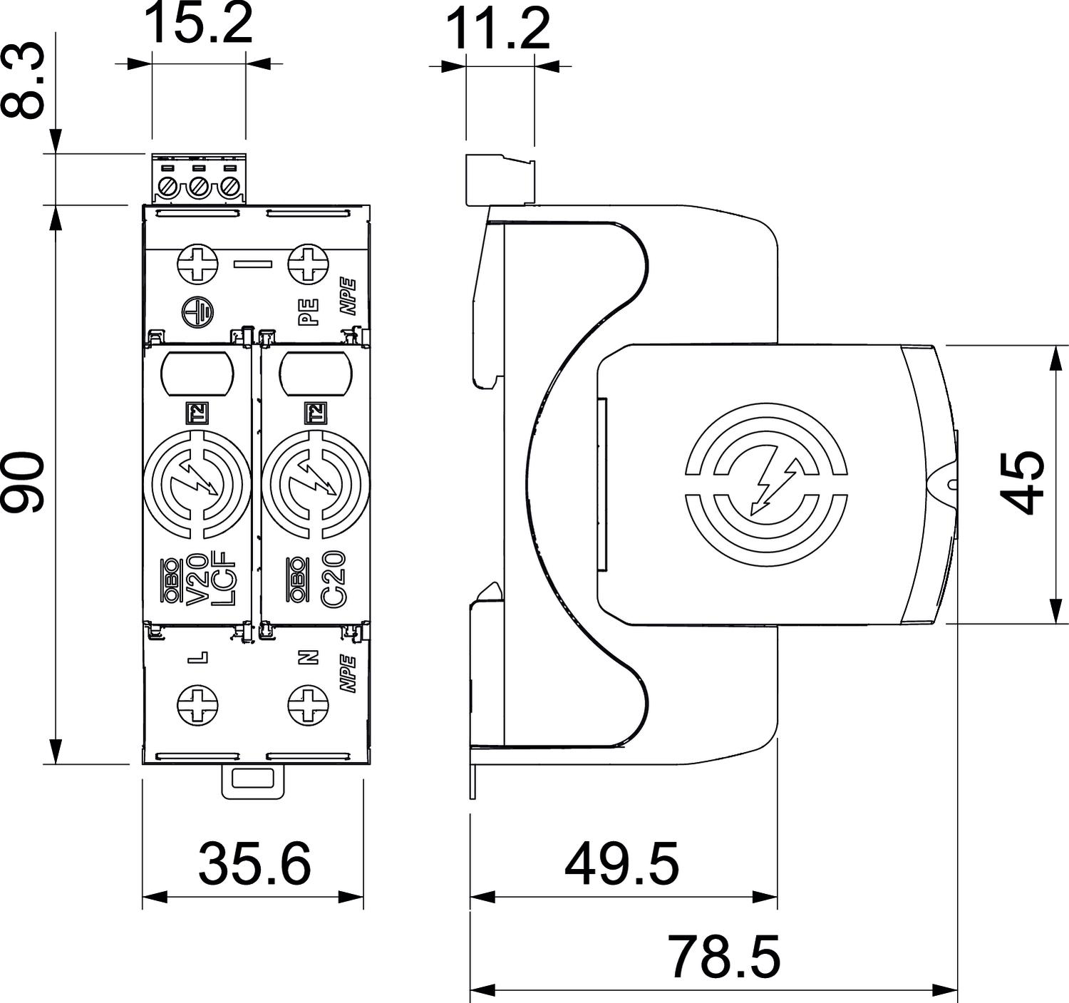 Overspanningsafleider V20, lekstroomvrij, 1-polig + NPE + FS
