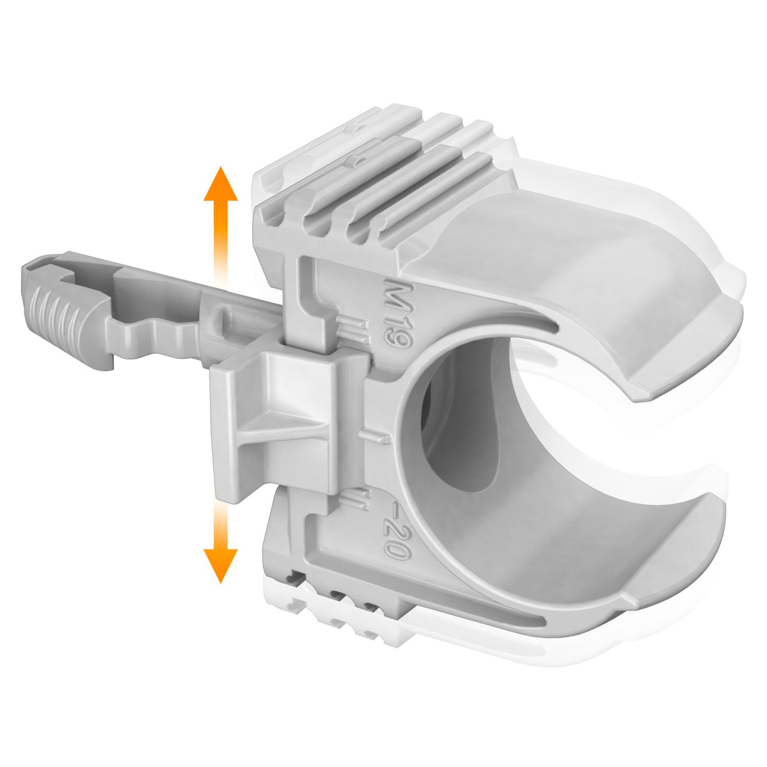 ProductbeschrijvingOpbouwklem voor opname van metrische metalen versterkte buis, lichte en zware isolatiebuizen en elektrische installatiebuis Quick-Pipe. Universele bevestigingsmogelijkheden aan de wand en plafond zowel in binnenopstelling als voor beschermde buitenopstelling. Met sleufgat voor zijwaarts uitlijnen bij montage met houtschroef of slagplug. Gereedschapsloze buismontage Ook koppelbaar met OBO Multi-Quick- of starQuick-klem. Grootte M16 - M32 kan op schroefdraad M6 worden geschroefd. Bevestigingsafstand 50 - 60 cm, max. uittrekwaarde F bij 20 °C kamertemperatuur zie tabel.