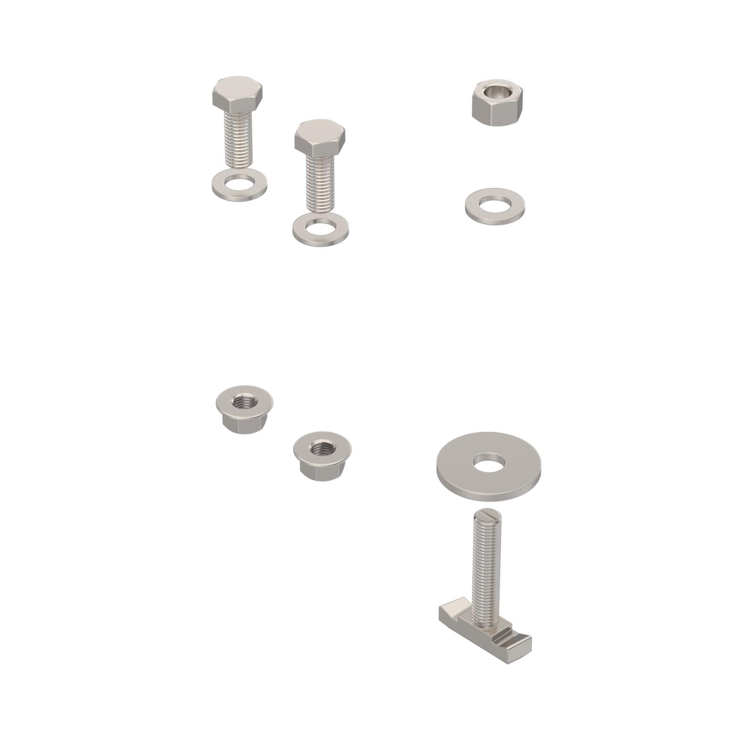 ProductbeschrijvingSchroevenset bestaande uit zeskantbouten M12, zeskantmoeren met flens M12, haakkopschroef en sluitringen. Voor het bevestigen van geperforeerde banden type LB FT op achterste steunen van voorgemonteerde dragers van het PV-montagesysteem vrij oppervlak.