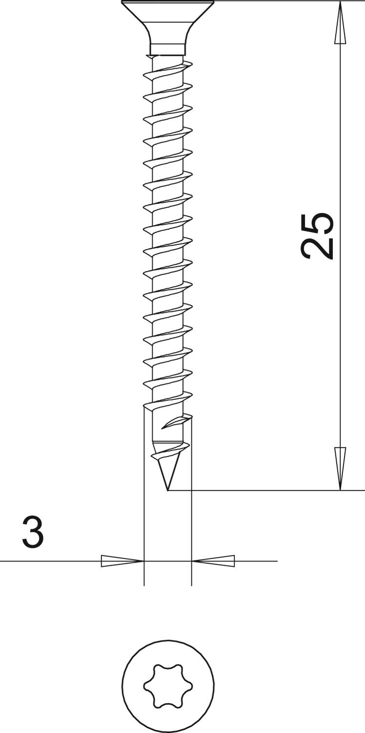 Dimensie 3x25mm Gehard ja Kopdiameter 5,6 mm Kopvorm Verzonken kop Lengte 25 mm Maat D 3 mm Maat L 25 mm Materiaal staal Oppervlak galvanisch verzinkt Schroefsysteem Torx - Alle typen
