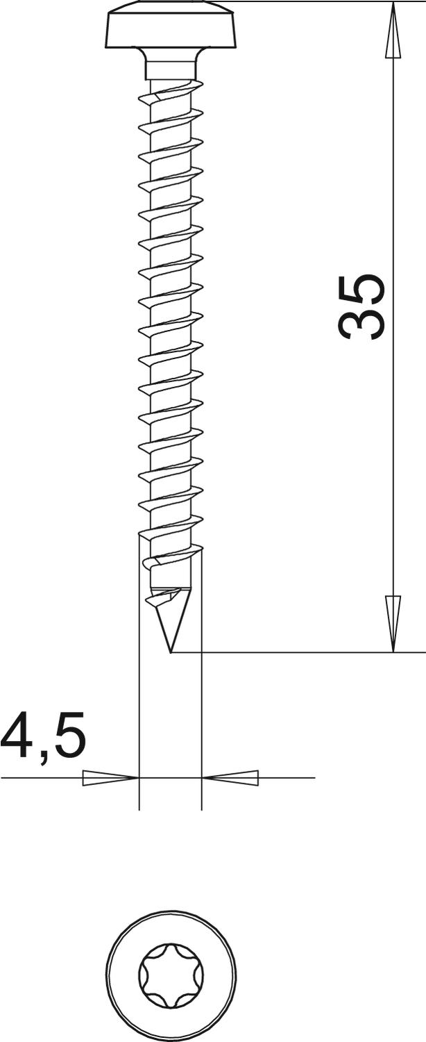 Dimensie 4,5x35mm Dubbele schroefdraad ja Gehard ja Kopdiameter 8,2 mm Kopvorm Panhead Lengte 35 mm Maat D 4,5 mm Maat L 35 mm Materiaal staal Oppervlak galvanisch verzinkt Schroefsysteem Torx Stijfsel 4,5 mm - Alle typen