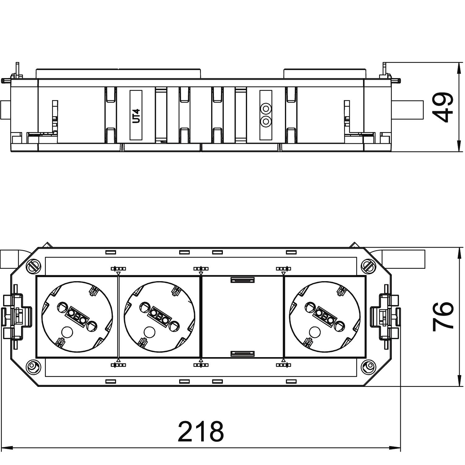 ProductbeschrijvingDe aansluitklare universele drager UTC4 beschikt over 2 voorgeïnstalleerde 33°-contactdozen met randaarde in oranje en een voorgeïnstalleerde 33°-contactdoos met randaarde in mintgroen en een blinde afdekking voor de latere installatie van een apparaat van de Module45- of Module 45 connect-serie, 250 V~ 16 A.