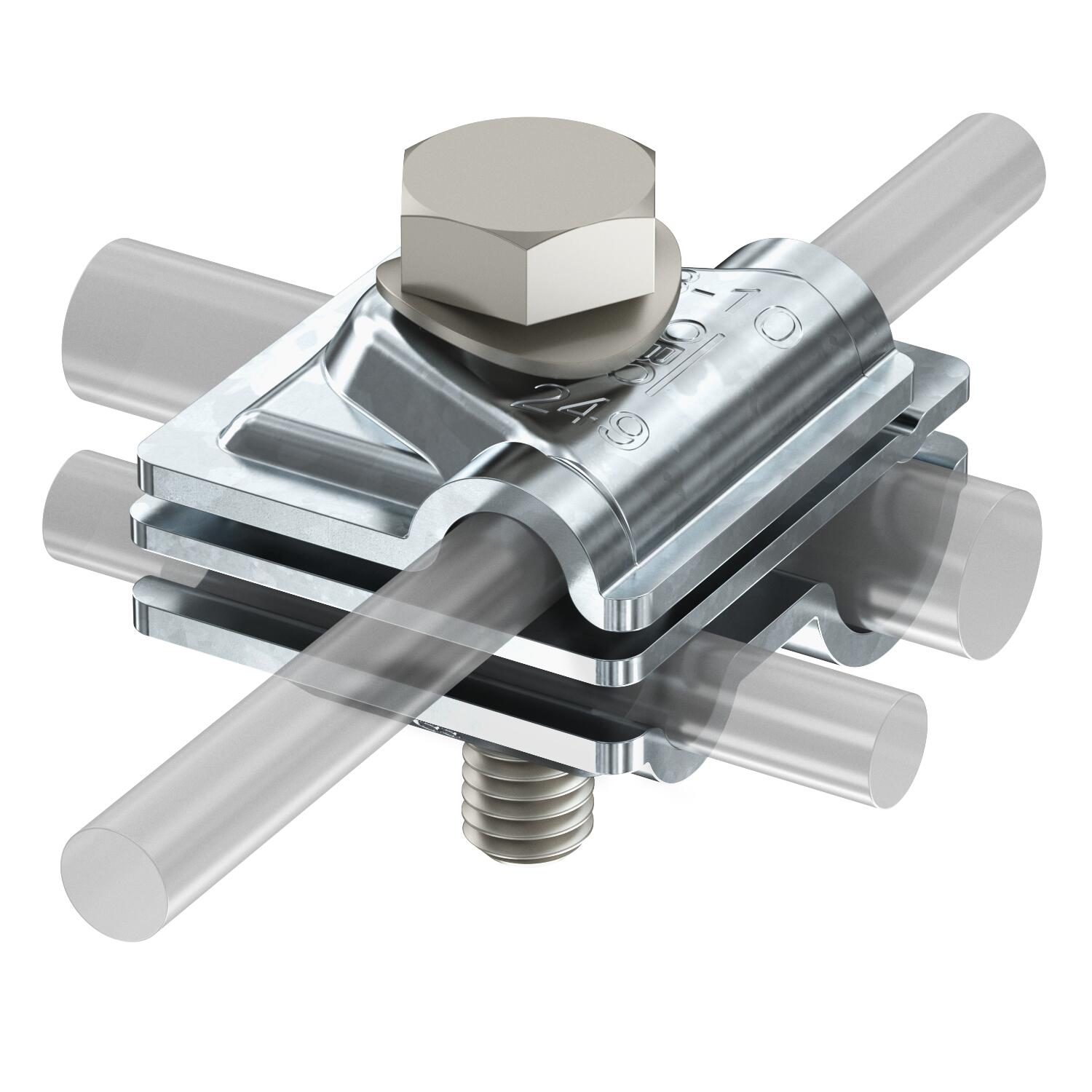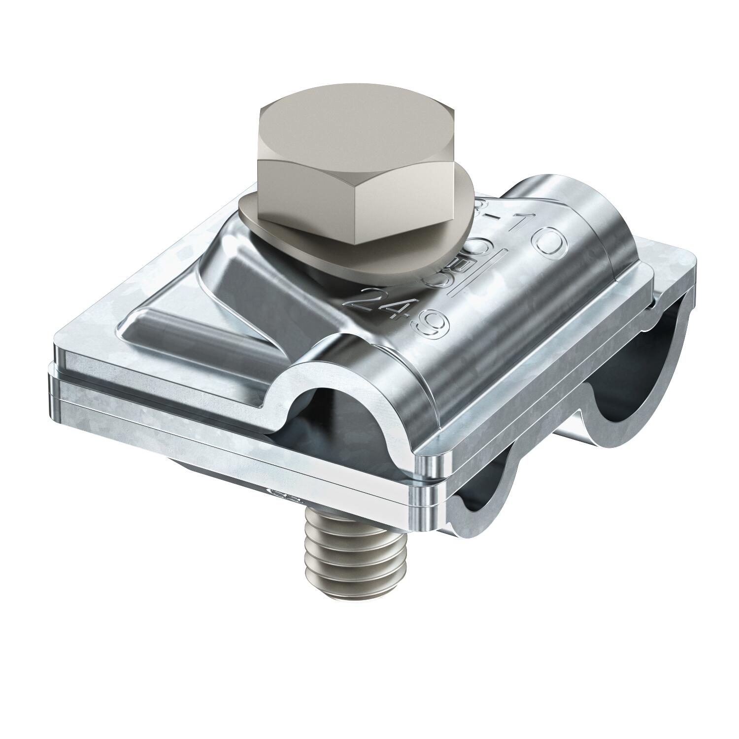 ProductbeschrijvingSnelverbinder voor maken van T-, kruis- en parallel verbindingen. Montage met schroef M10 x 40 van roestvast staal. Passend voor wapeningsstaal ø 6-16 mm en ronde geleider ø 8-10 mm. Voldoet aan de eisen conform VDE 0185-305 (IEC62305).