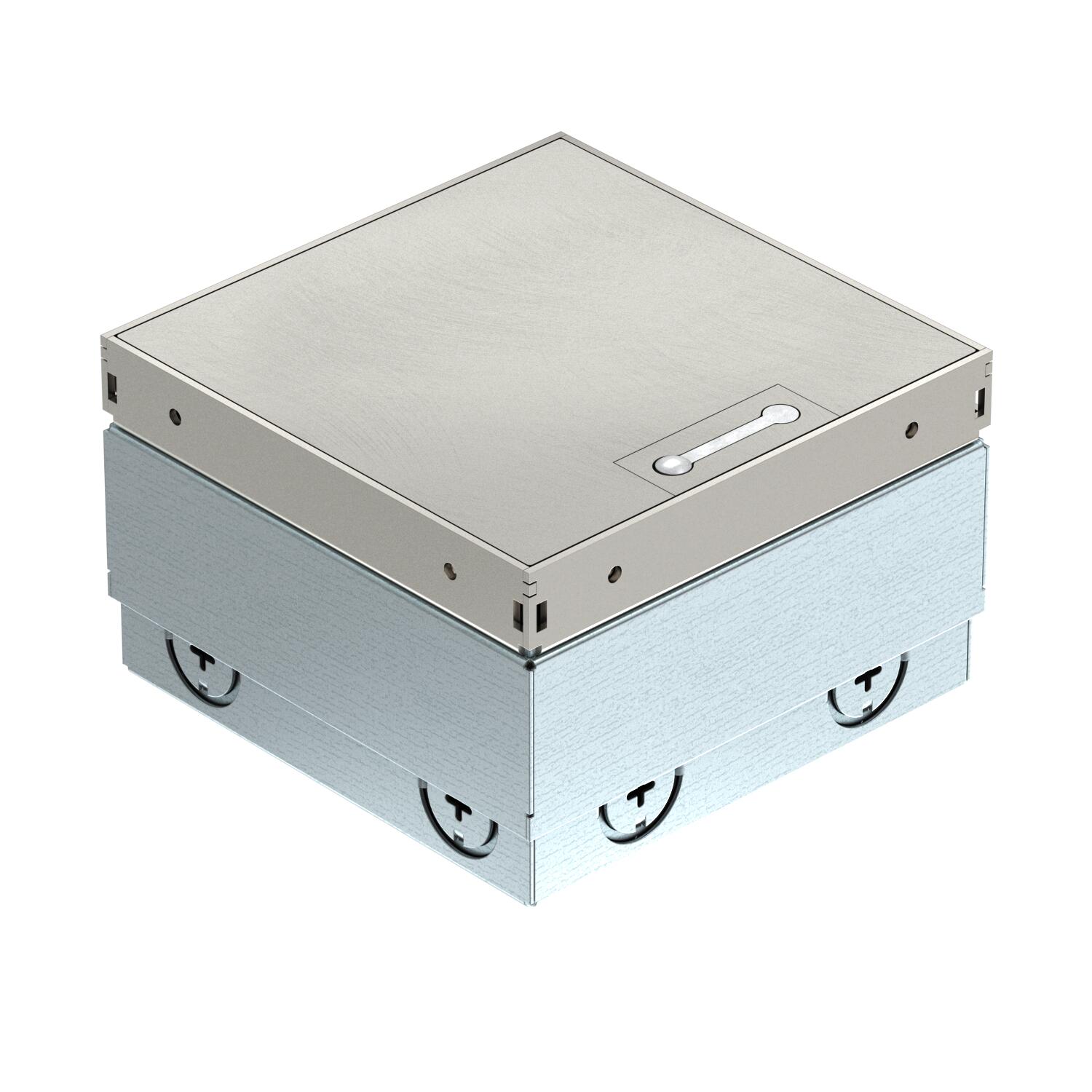 ProductbeschrijvingVierkante vloerdoos voor toepassing in droog onderhouden holle vloeren en voor inbouw in dekvloeren binnen. Inbouwbehuizing met voorgeponste invoeropeningen voor buizen (M20/M25). Bovenste deel dankzij 4 nivelleersteunen aanpasbaar aan de bovenkant van de vloerbekleding. De minimum installatiehoogte is 100 mm, met een nivelleringsbereik van + 35 mm Zichtbare delen in RVS in de vloerbekleding Deksel met decorplaat en borsteluitlaat voor kabelgeleiding. De belastbaarheid van 15 kN is alleen in niet gebruikte toestand gewaarborgd. Lege behuizing voor max. 2 modules 45®-inbouwapparaten in de montagedrager en 2 data-outlets in de optionele datatechniekdrager.