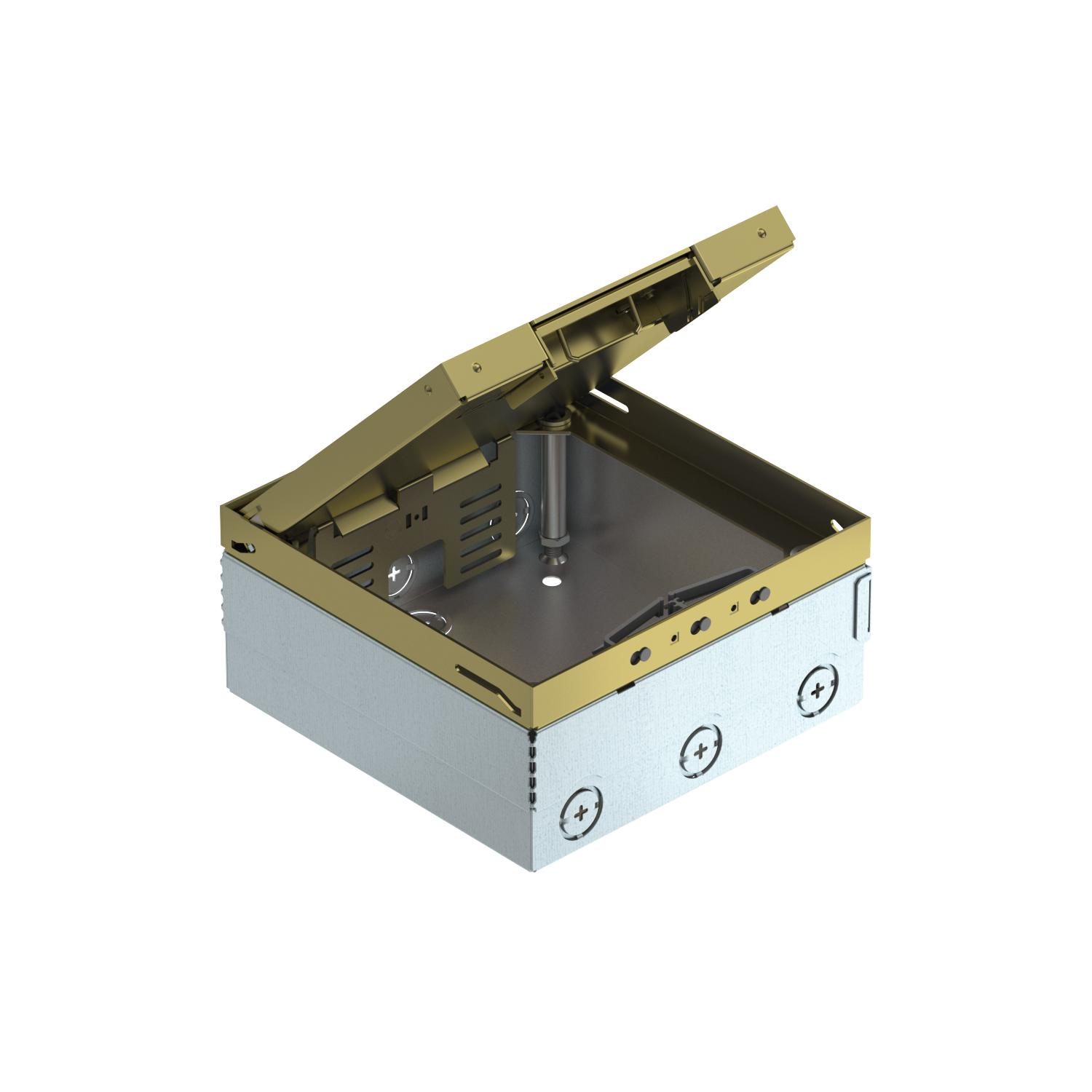 ProductbeschrijvingVierkante vloerdoos voor toepassing in droog onderhouden holle vloeren en voor inbouw in afwerkvloeren binnen. Inbouwbehuizing met voorgestanste invoeropeningen voor buizen (M25). Lege behuizing voor max. 2 universele dragers UT3 voor max. 6 Modules 45®-inbouwapparaten. deksel dankzij 4 nivelleersteunen aanpasbaar aan de bovenkant van de vloerbekleding. De minimum installatiehoogte is 95 mm, het nivelleringsbereik + 30 mm.