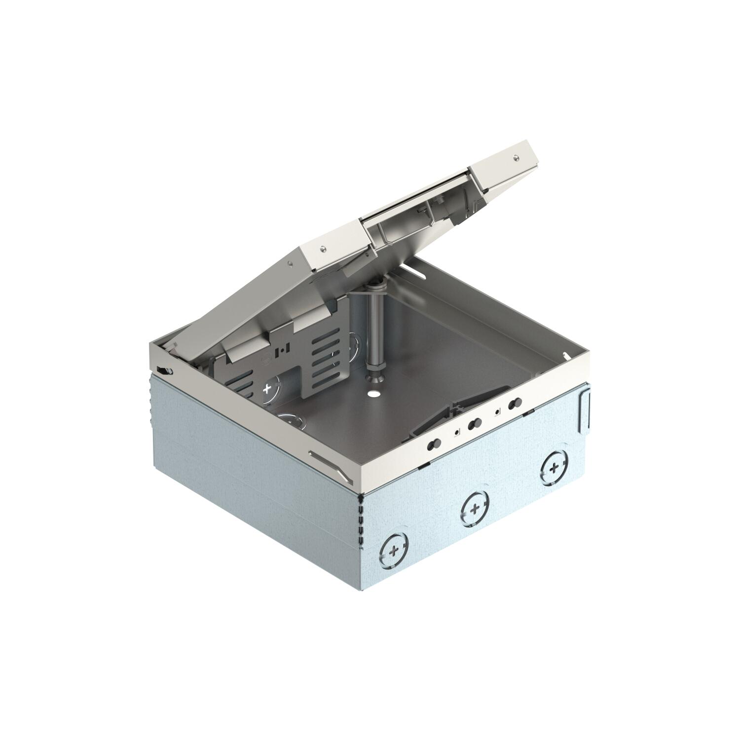 ProductbeschrijvingVierkante vloerdoos voor toepassing in droog onderhouden holle vloeren en voor inbouw in afwerkvloeren binnen. Inbouwbehuizing met voorgestanste invoeropeningen voor buizen (M25). Lege behuizing voor max. 2 universele dragers UT3 voor max. 6 Modules 45®-inbouwapparaten. deksel dankzij 4 nivelleersteunen aanpasbaar aan de bovenkant van de vloerbekleding. De minimum installatiehoogte is 95 mm, het nivelleringsbereik + 30 mm.