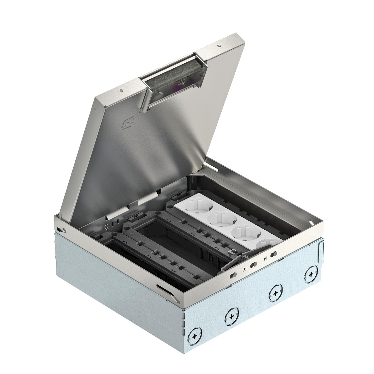 Vierkante vloerdoos voor toepassing in droog onderhouden holle vloeren en voor inbouw in afwerkvloeren binnen. Inbouwbehuizing met voorgestanste invoeropeningen voor buizen (M25). Met 3 universele dragers UT4 en 2 2-voudige contactdozen met randaarde. Bovendeel dankzij 4 nivelleersteunen aanpasbaar aan de bovenkant van de vloerbekleding. De minimum installatiehoogte is 95 mm, het nivelleringsbereik + 30 mm.