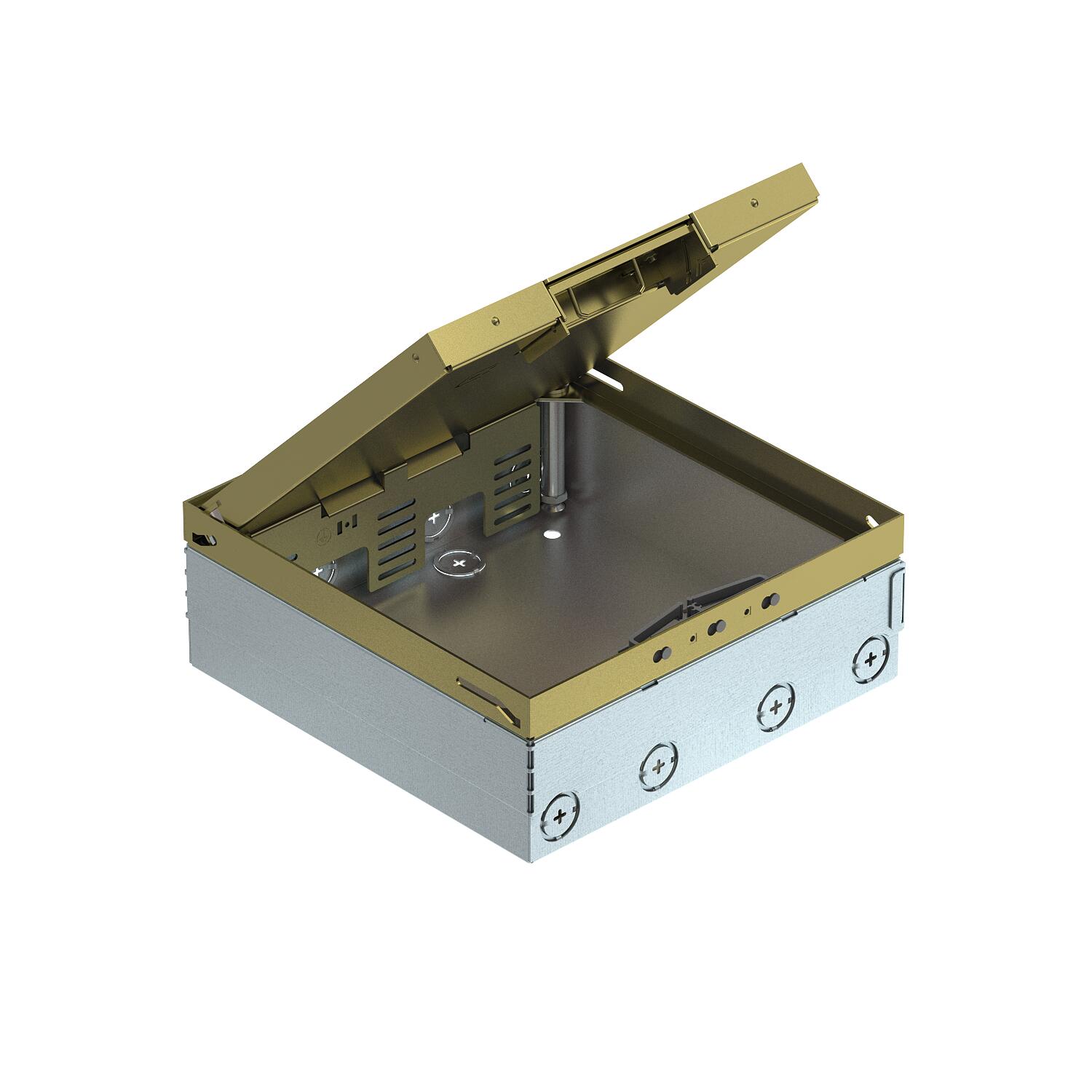 ProductbeschrijvingVierkante vloerdoos voor toepassing in droog onderhouden holle vloeren en voor inbouw in afwerkvloeren binnen. Inbouwbehuizing met voorgestanste invoeropeningen voor buizen (M25). Lege behuizing voor max. 3 universele dragers UT4 voor max. 12 Modules 45®-inbouwapparaten. deksel dankzij 4 nivelleersteunen aanpasbaar aan de bovenkant van de vloerbekleding. De minimum installatiehoogte is 95 mm, het nivelleringsbereik + 30 mm.