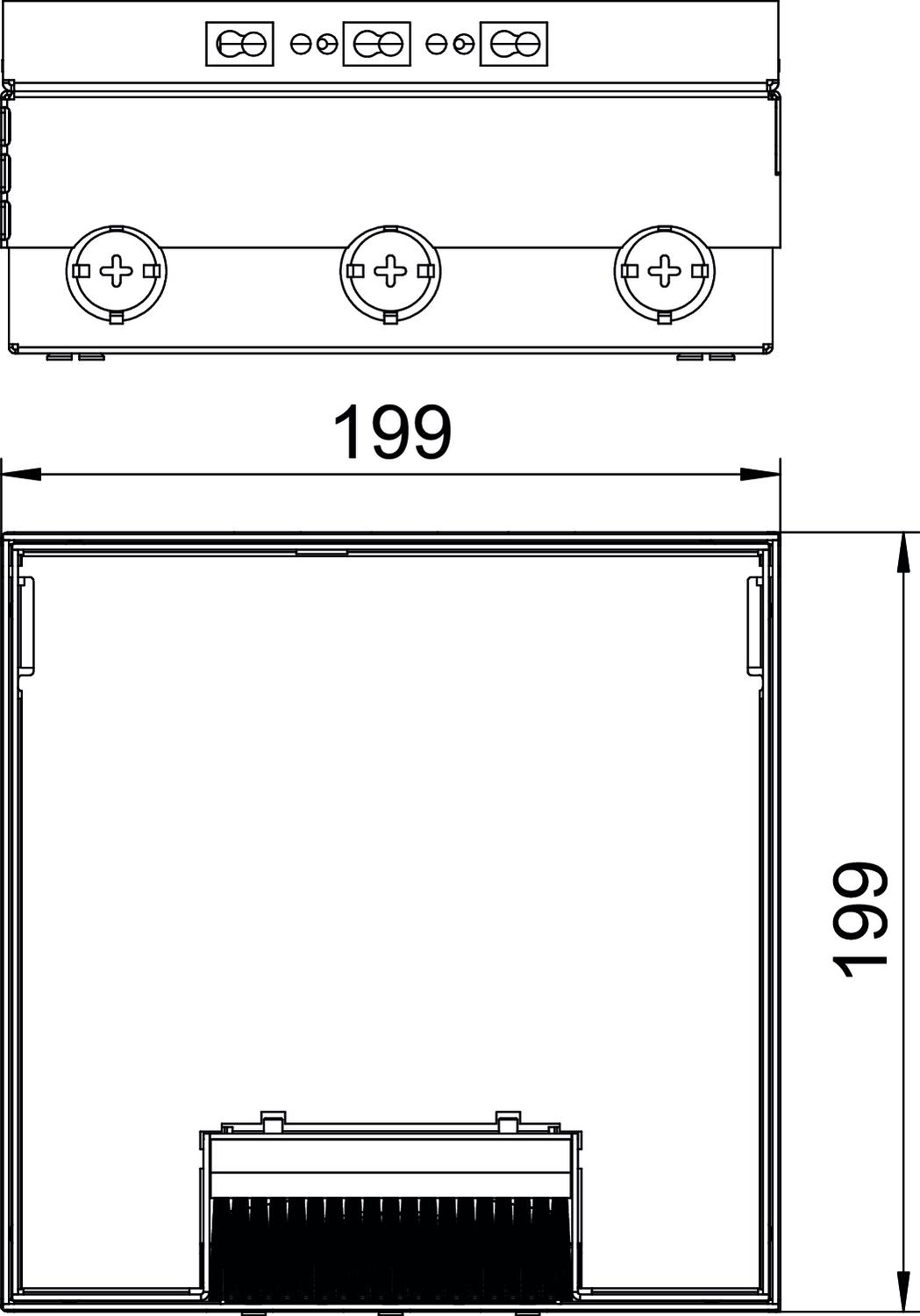 Inbouwbehuizing met voorgestanste invoeropeningen voor buizen (M25). Het deksel is door middel van vier nivelleringssteunen aanpasbaar op de bovenkant van de vloerbekleding. De minimale inbouwdiepte is 95 mm, het nivelleerbereik + 30 mm.