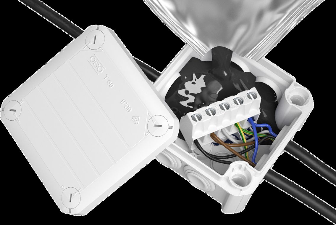 De T60 kabeldoos in combinatie met onze hoogwaardige giethars biedt de ultieme bescherming voorelke elektrische verbinding. Of het nu gaat om vochtige omgevingen of ondergrondse installaties, dezeset garandeert een100% waterdichte afsluiting.