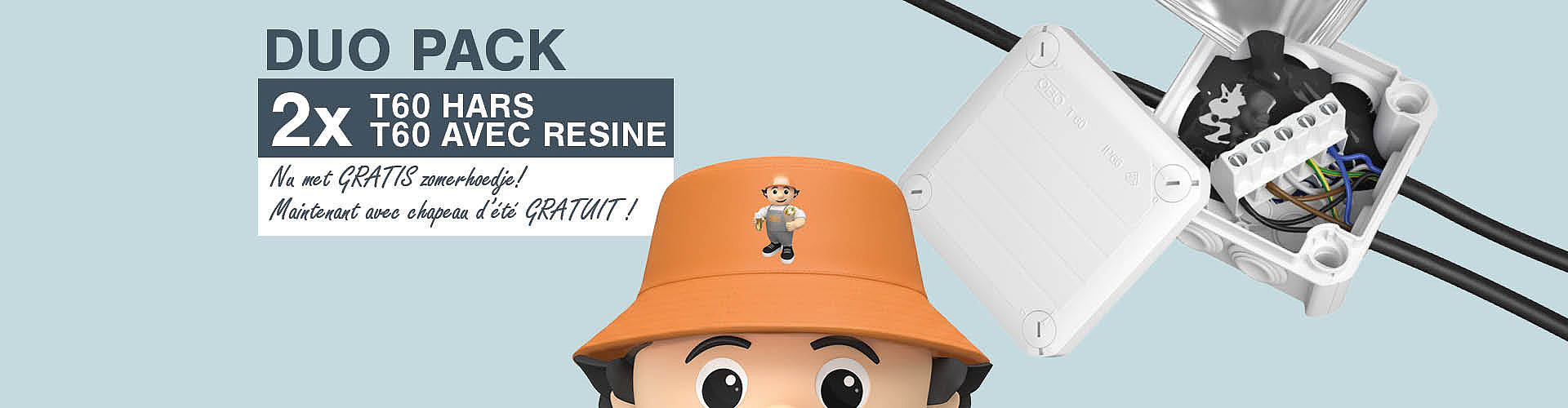 Tijdelijke actie: Scoor je OBO zomerhoedje! Ontvang nu een exclusief OBO zomerhoedje cadeaubij aankoop van een T60 Hars Duopack. Zo ben je niet alleen verzekerd van een waterdichteinstallatie, maar ben je zelf ook optimaal beschermd tegen de zon tijdens het werk.