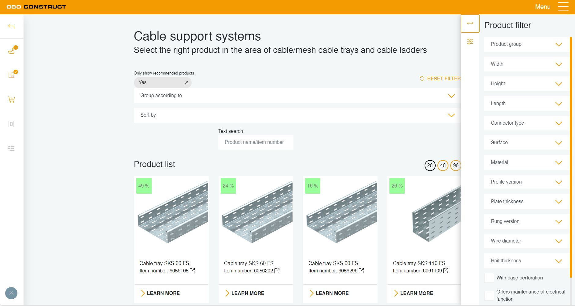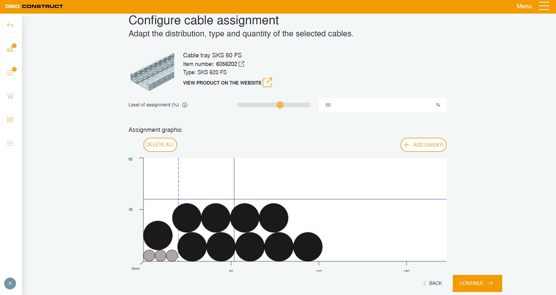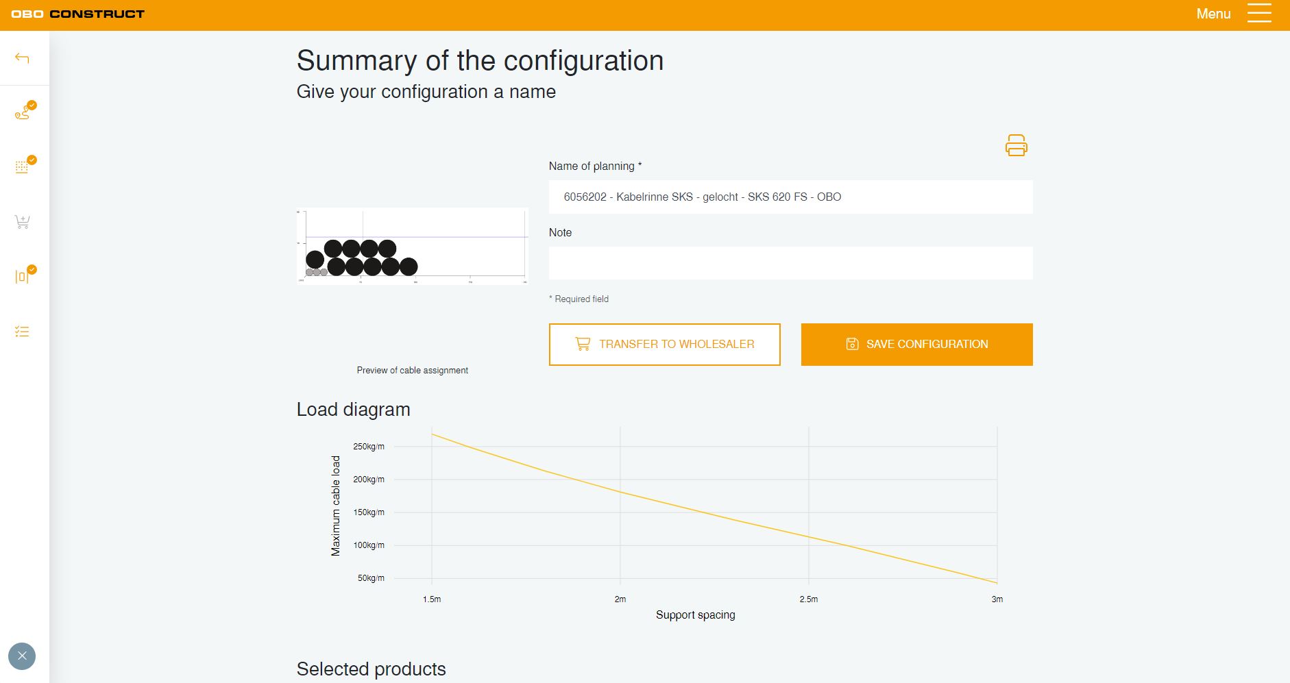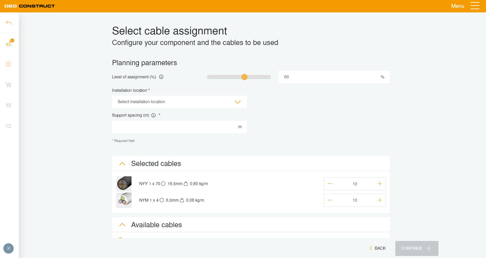 De planningstool maakt het mogelijk om het kabelvolume te berekenen voor zowel kabeldraagsystemen als ondervloerkanalen binnen een project Verschillende bezettingsparameters zoals installatieplaats, steunafstand, bezettingsgraad evenals het aantal en soort leidingen en kabels kunnen worden geselecteerd en begeleiden de gebruiker zo stap voor stap naar de productkeuze.
